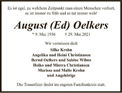Am 9. Mai erlebte unser lieber Ed, noch seinen 85. Geburtstag, 85 Jahre voller Ereignisse und Erlebnisse. August (Ed) Oelkers hat seit 1943 in Niendorf gelebt und die Entwicklung unseres schönen Stadtteils miterlebt. Seit 2003 war er Mitglied im Niendorfer TSV, hat beim Jedermann-Turnen und schließlich auch in unserer Laienspielgruppe, als Bühnenbauer mitgewirkt. Nach seiner Ausbildung im Telegraphenamt und späterer Laufbahn bei der Post, war Ed durch sein Dienstfahrzeug begeisterter Motorradfahrer und Enthusiast. Ich erinnere mich an viele lustige Motorradgeschichten, die wir ausgetauscht haben. Für die Zweiradkenner unter Euch sei erwähnt, dass Ed eine der ersten Honda-Goldwings in Hamburg hatte. Durch sein Hobby hat er sich das Basteln und Schrauben an Autos und Motorrädern angeeignet, und konnte auch im Alltag alles reparieren. Er hatte für alles ein Werkzeug, und war ein passionierter Tüftler und Sammler. Dank seiner Ideen und tatkräftigen Unterstützung haben wir immer tolle Bühnenbilder für Euch zaubern können. Als die Knochen dann nicht mehr so wollten, hat er sein Fachwissen weitergegeben und uns moralisch unterstützt.